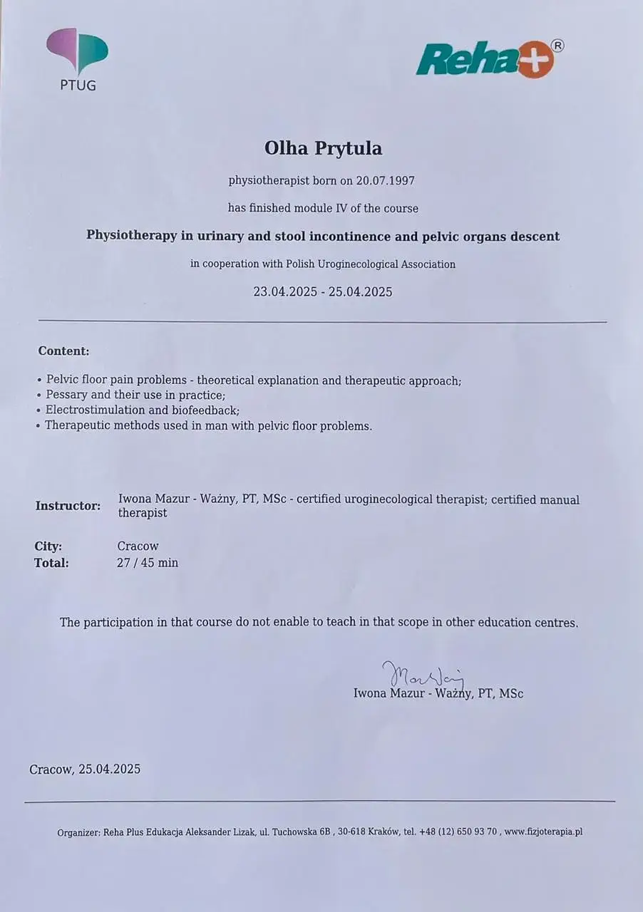 Комплексна фізіотерапевтична підтримка для майбутніх мам: дихальні практики, робота з тазовим дном, вправи для зменшення болю та підвищення мобільності. Готуємо тіло до м’яких, свідомих і контрольованих пологів.
